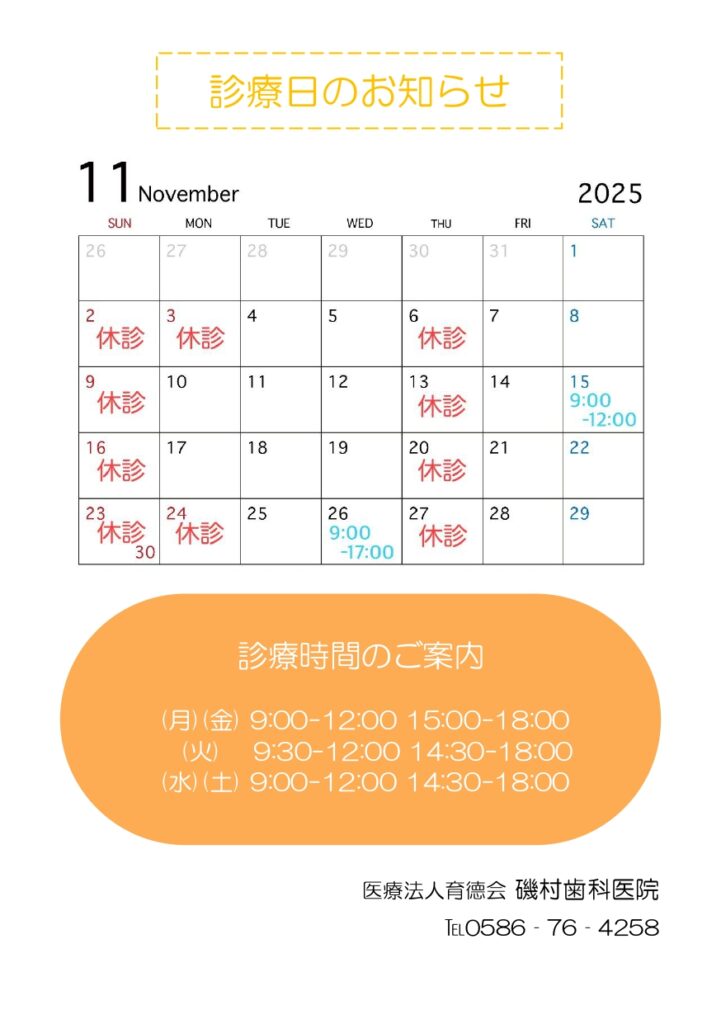 いつもありがとうございます!下記に2025年11月の診療日をお知らせします。
