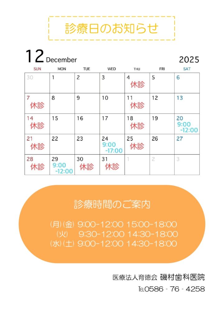 【2025年12月】磯村歯科医院の診療時間と休診日のお知らせ